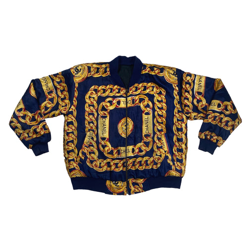 RARE VINTAGE CHANEL SILK BOMBER JACKET NAVY GOLD